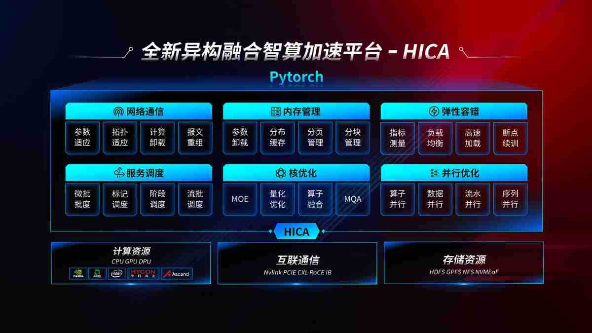 通过自研的服务层、、、中间适配层、、、以及调度编排算法,,采用数据并行、、、、模型并行等多种并行方式,,,把并行计算任务进行有效的分解,,,使其分别由相应的软件栈和算力资源来承接。。。。当GPU资源变化,,HICA可以实时动态调度计算子任务并调整模型拓扑和架构,,,以充分聚合各种算力资源。。。