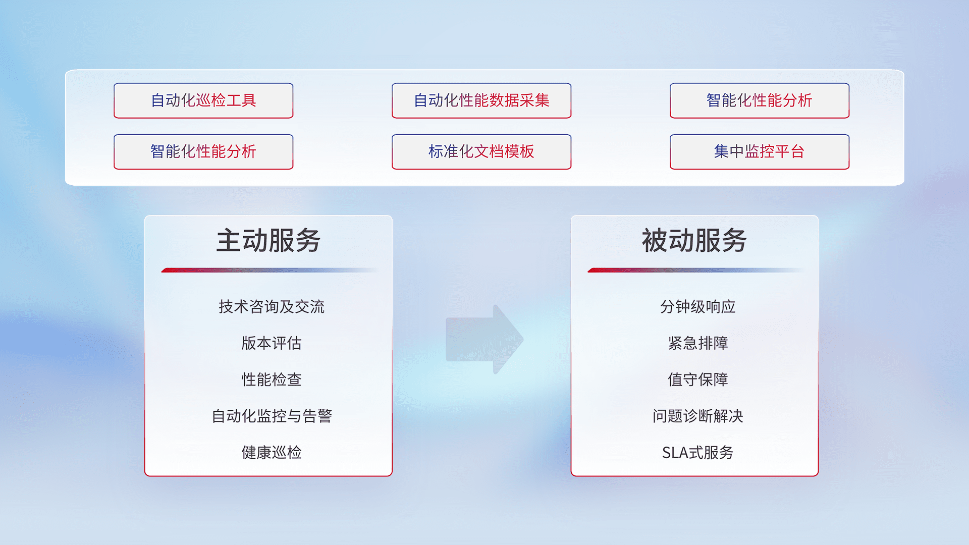 智能化工具和标准化文档,,保障服务质量,,提供主动服务(包含技术咨询、、版本评估、、、性能检查、、自动化监控与告警、、、、健康巡检)和被动服务包含(分钟级响应、、紧急排障、、、值守保障、、、、问题诊断解决、、SLA服务)。。